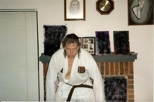 I was going through some old pictures, and I came across a picture taken the moment I got home from my test to move from “Probationary” 1st degree black belt, to “Decided” 1st degree black belt. Now, there are many and more organizations who do not divide up the black belt ranks to this extreme, but they all find little ways of making extra money from the extra testing fees.I wasn’t standing up straight, but not out of trying to look intimidating (although I WAS rather young at the time, and trying to look intimidating was something which almost surely crossed my mind whenever I was going to have my picture taken). The truth is, I was hurt pretty badly. I am a very big guy (6’5” tall, and at that time I was about 235 lbs.), and have always had a higher than normal tolerance for pain. I would never go so far as to say that I like pain, but I seem to be able to deal with it a lot better than many of the people that I know. As part of the test to move up to that rank, there was almost a gang initiation type of beating which had to be undertaken. Well, I undertook, and gave as much as I got, but I got a LOT. When I look at that picture, I am transported back to that time and place. I can still feel the ache in my ribs from the kick that I took from Robert Lambert, whose thighs measured the same as my waist did back then; and none of it fat – solid bone crunching muscle! THAT is the real reason I am not standing up straight in the picture. If you are reading this, Mr. Lambert, I still owe you! I am almost ashamed of how much fatter I am now than then, but this was back before I married a woman who can cook better than any five star chef, so it is an even trade in my opinion. At the time this picture was taken, I had been training in the martial arts for over a decade, and in Taekwondo for nearly two years. The funny thing to me is this; although we gave and took some very rough shots, and as bad as things turned out in my relationship with the USTA, those were still some of the best days I had in my 20’s. I knew some really great martial artists in the USTA. Richard Johnson, my Instructor would be on the list, of course. Daniel Perio was supremely talented, and his family was one of the best one could ever hope to meet. There were the Rigden brothers, Eric and Micah. The Sheffields, twins who were as gracious and friendly as they were talented. Arnold Trevino had tremendous skill as well. What is funny is that the people who impressed me the most were not the people at the top of the company, but the grunts like me who were pounding day in and day out, giving our absolute best. Whatever I may say about the USTA, the people I met there were fantastic!
